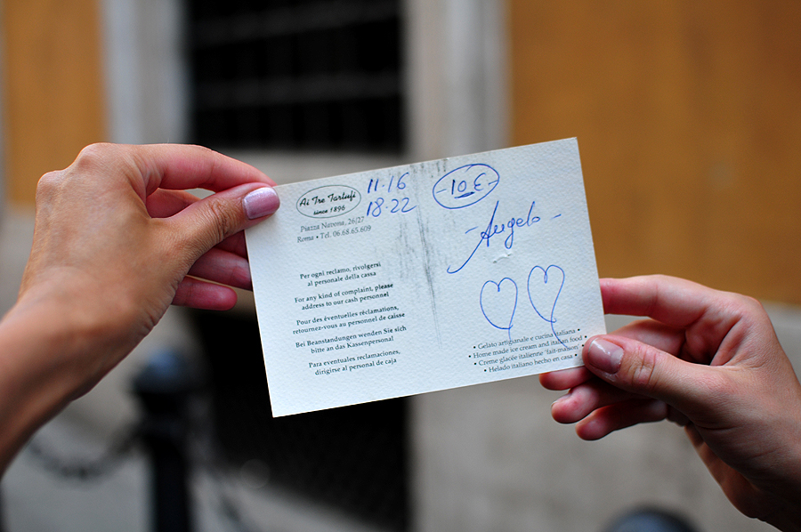 Kaip ir reikėjo tikėtis - nieko labai jau ypatingo... Ko norėti iš Navonos aikštės ir turistinio taško. Bet susipažįstame su savininku Angelo - trumpai paplepėjus iš kur mes ir kaip mums Roma tema, duoda nuolaidą vakarienei. Na, užteks mums deserto reklamos :)