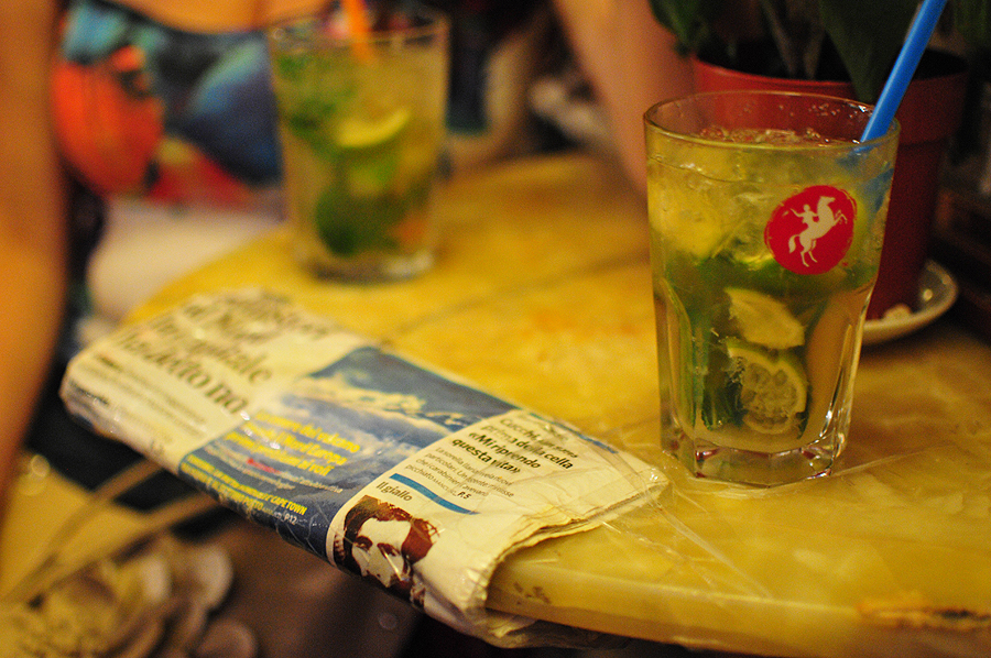 Vakarop išsiskiriame su draugais - jiems iki namų reikia važiuoti metro, kurio darbo laikas iki 12. O mes su sese patraukiame per šiltą naktinę Romą, pilną veiksmo... Užsukame į bariuką kokteiliuko, šis staliukas tiesiog sužavi - stalas suremontuotas, skylė užklijuota laikraščiu ir lipnia juosta :) bet gėrimai - nepriekaištingi!
