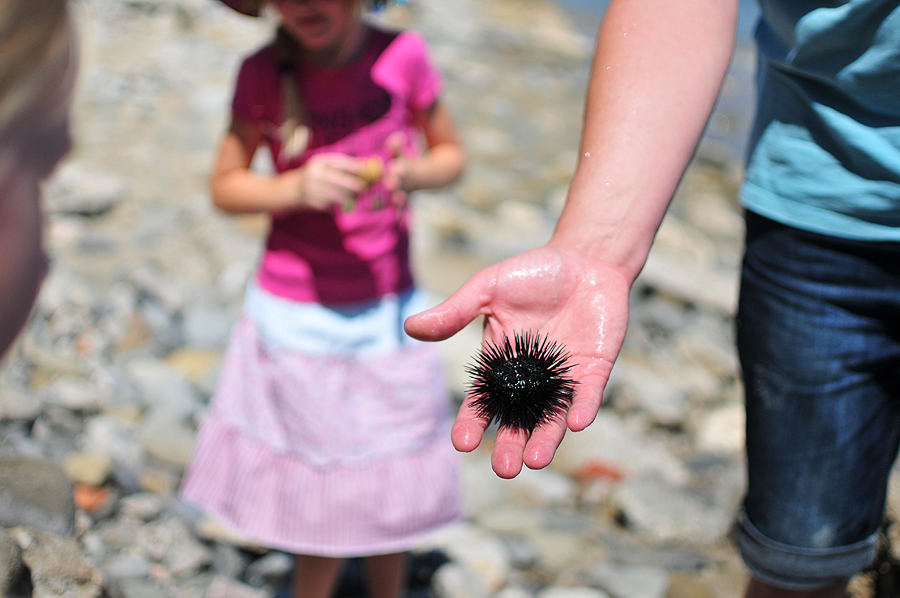 Dėstoma paskaita apie jūros ežius - kaip saugotis, neužlipt, neimt. Ta pačia proga ir demonstruojama draudimai gyvai.