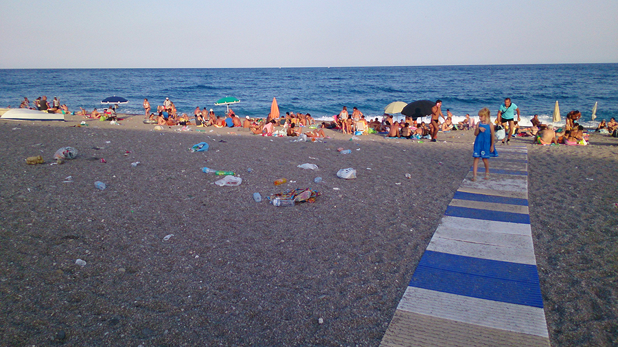 Maudomės gražioje švarioje jūroje Fondachelo miestelyje. Privatūs viešbučių pliažai sutvarkyti, gultai, dušai ir t.t., bet miesto pliažas atrodo taip. Vėl džiaugiuosi, kad matėme ne tik tokią Siciliją...
