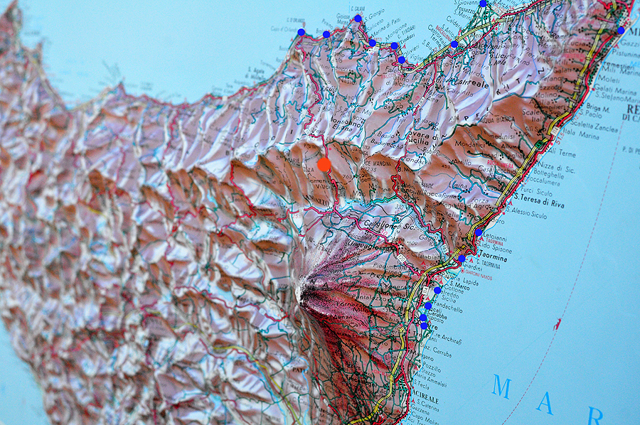 Mūsų išvažinėti maršrutai, dar nesimato žemėlapio apačioje 3-4 taškų. Labai geras vaizdas žemėlapio, man patiko, kad matosi aukščio mastelis. Raudonas taškas - mūsų gyvenamoji vieta. Esu labai patenkinta pasirinkimu, nes pamatėme tikrąją, autentiškąją Siciliją, neturistinę...