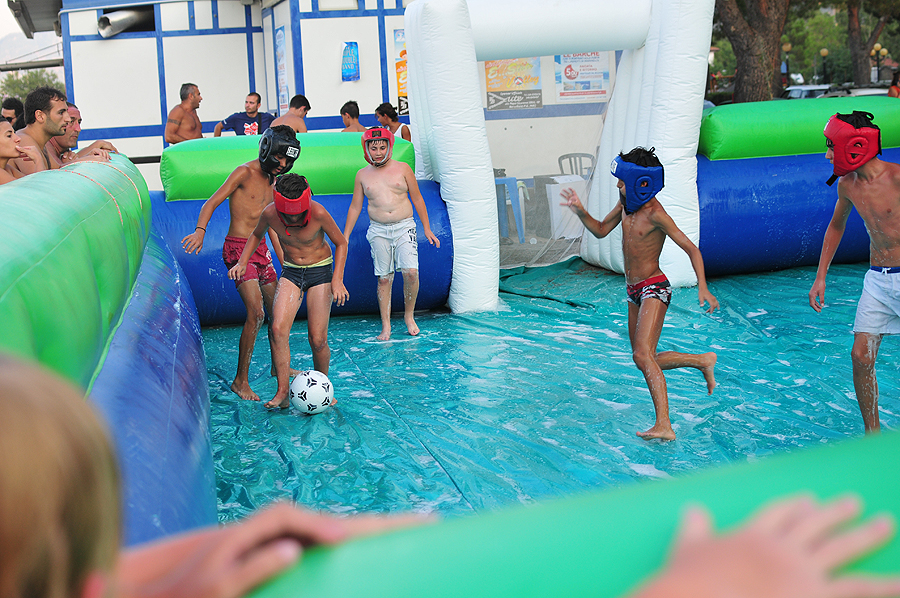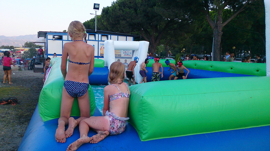 Jau po visos dienos maudynių vaikai pastebi italiukus, žaidžiančius futbolą muolo putose.