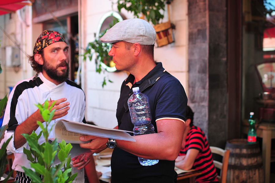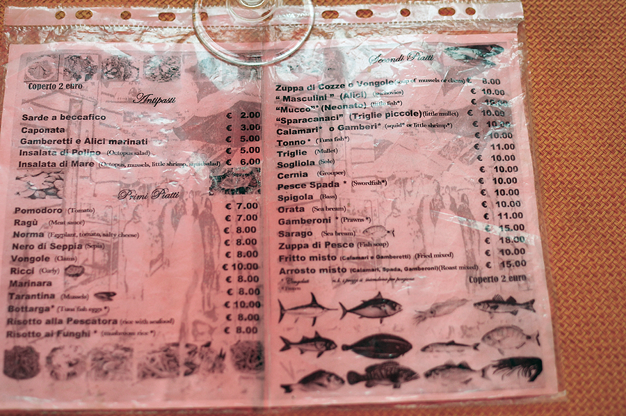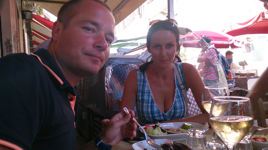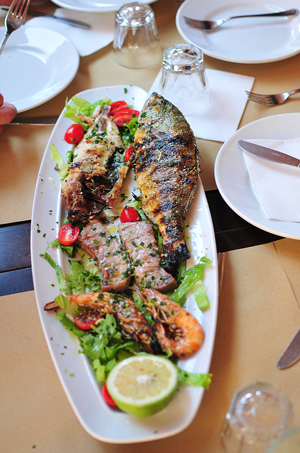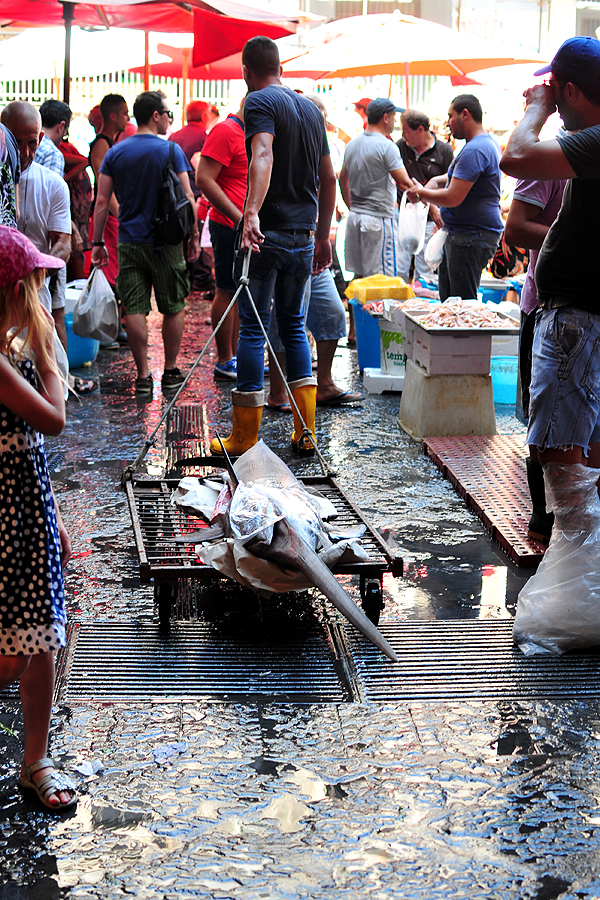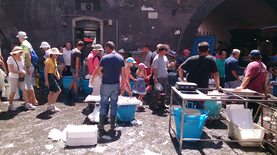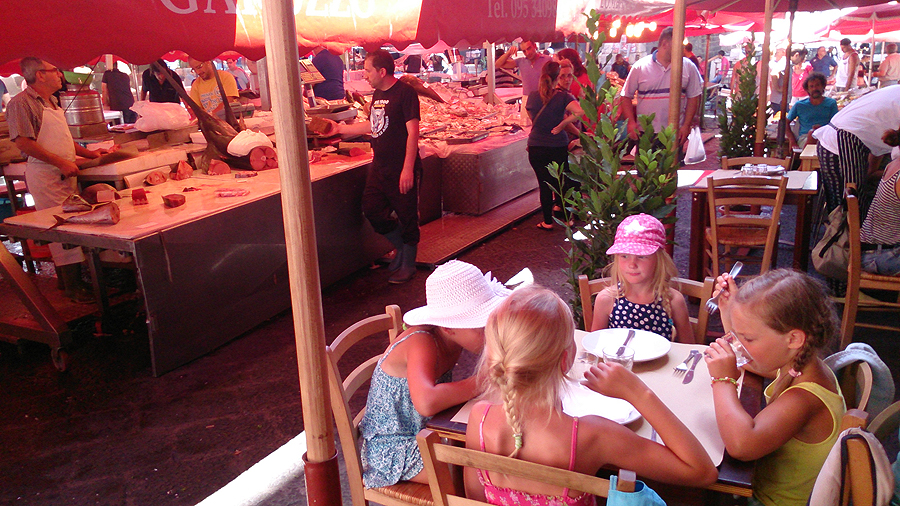Vis tik dauguma prekeivių dar dirba, praėję pro prekystalių labirintą, randam bariuką, kuriame galima užsisakyti žuvį iš prekeivių, tau ją čia pat iškepa. Valgom skaniai, aplink kvepia šviežia žuvimi, prie balto vyno taurių dalijamės sicilietiškų atostogų įspūdžiais su naujaisias pažįstamais, dar pradeda groti gyvos muzikos linksmas trio - jaučiamės nuostabiai!