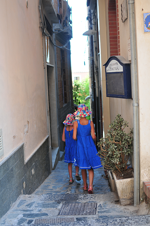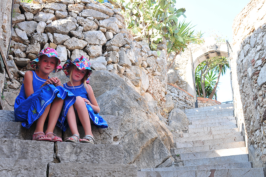 Užkilome į Castelmolos pilį Castello di Mola. Vaizdai fantastiški iš didelės apžiūros aikštelės, daug daug laiptelių į viršų, daug daug vaikų zyzimo kepinančiame karštyje.
