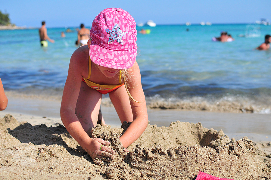 Vaikai nelabai noriai maudosi, čia paliekame ir vienišą stirksantį skėtį nuo saulės - namo nesivešim.