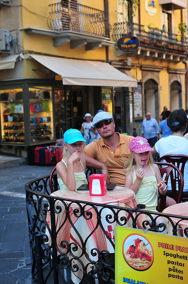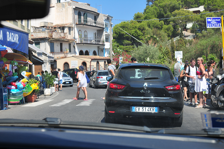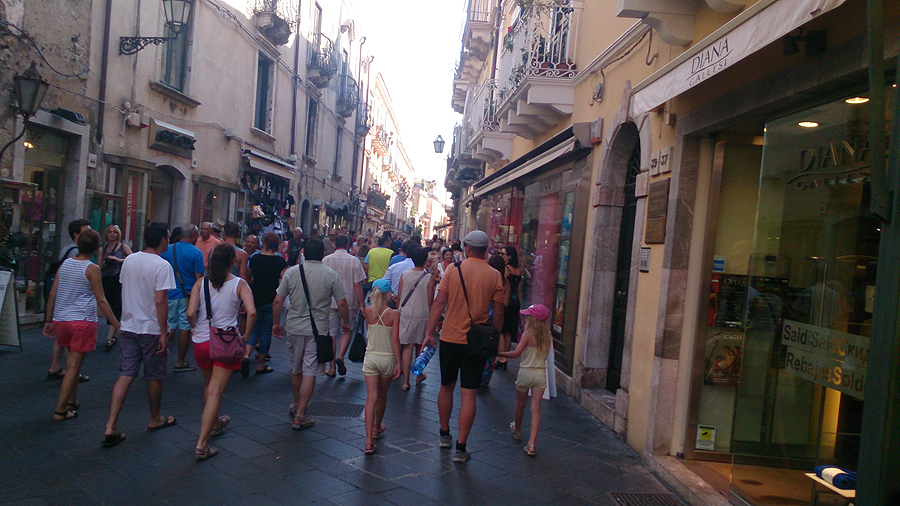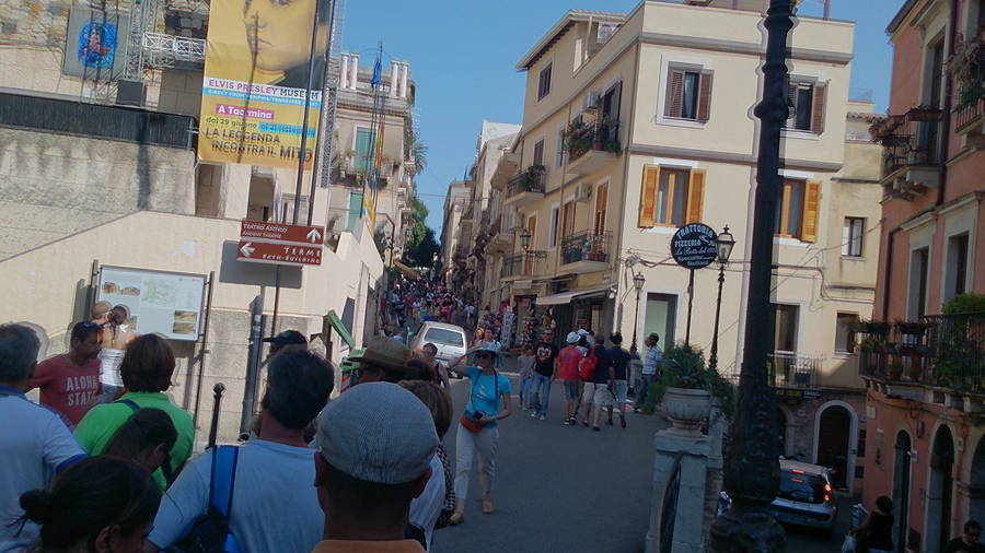 Ir iš savo ramumos atvažiuojame į baisinį judesį Taorminos rajone, milijonas žmonių, visi kažkur skuba, rėkauja, stumdosi - atostogauja.
