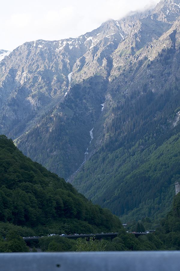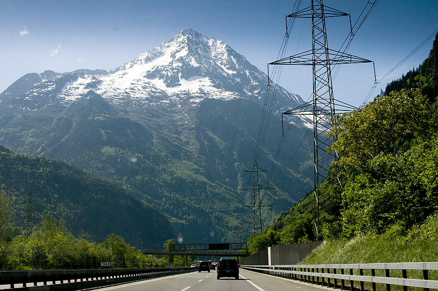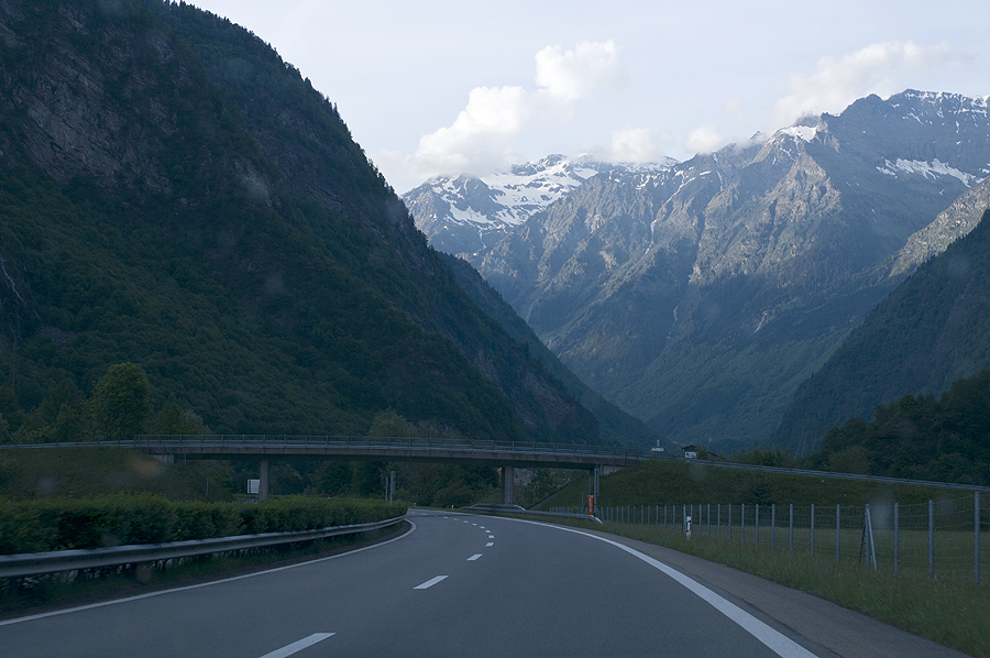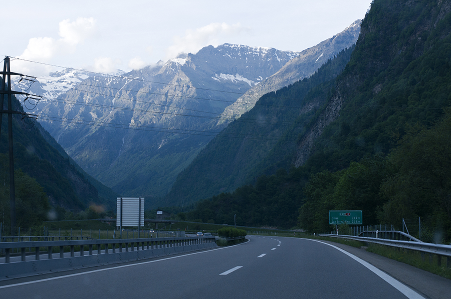 Mes jau Šveicarijoje, 20 val vakaro... Mūsų kalnai jau šalia - va jie, gražuoliai... neatsižiūriu... per radiją sako, kad prie Gotardo tunelio 10km kamštis, tad sukam link San Bernardino tunelio - kelias NEREALUS! Kalnai, kriokliai, dideli...