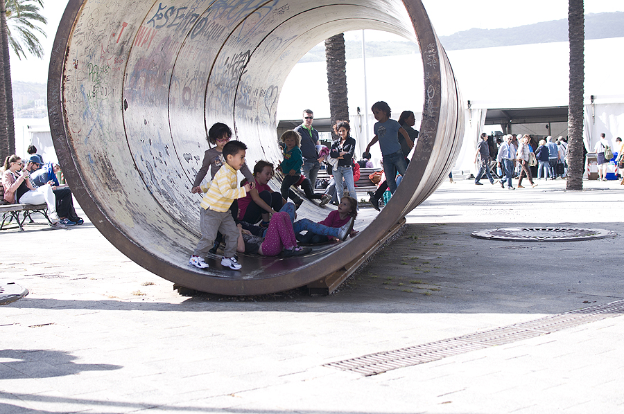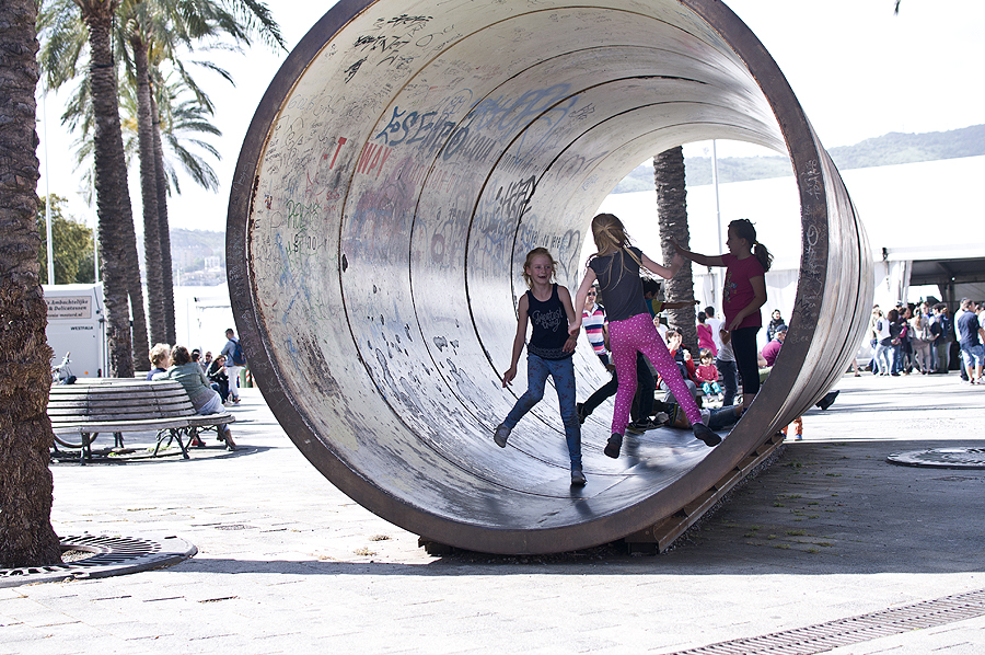 Čia parduotuvių ir didelių gražių senovinių namų rajonai - miesto centras. Prisėdame bariuke, užkandame. Grįžtame į palmių krantinę laukti tėčio. Vaikai laksto "vamzdyje", pradžioje vienos, paskui prisijungia kiti vaikai.