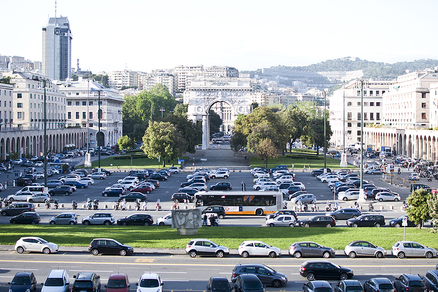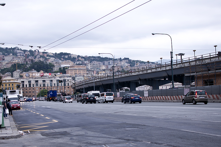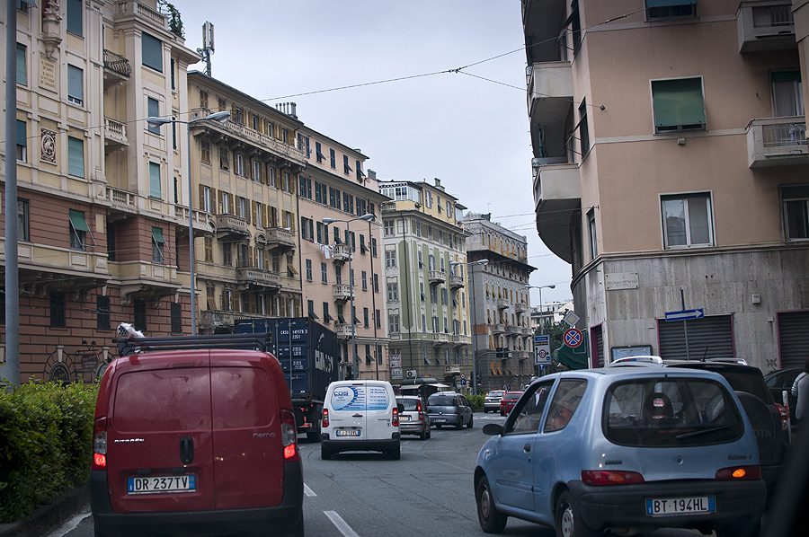 Lekiame greitkeliu, vingiuojame kalnais jau netoli Genujos ir įlekiame tiesiai į patį Genujos centrą, šalia savo viešbučio tuo pačiu greitkeliu. Kelionė 400km truko nuo 10 iki 17 val, su kamščiais, tuneliais ir sustojimais užkąsti. Pirmi 200km važiavome 4val, o nuo Milano iki Genujos 200km atlekiame per 1,5val - geras greitkelis. Bet nuobodokas.