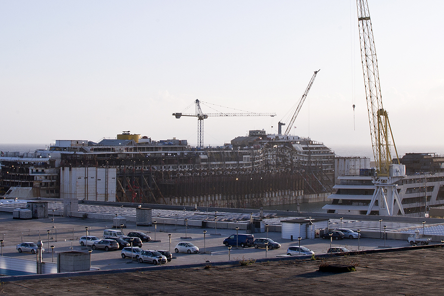 Einam palei uostą iki "namų" - tolumoj pamatom nerealų vaizdą - čia tas laivas, kur sausio mėn skendo šalia Italijos krantų... matosi "įdubėlė" jame... remontuojamas dabar.