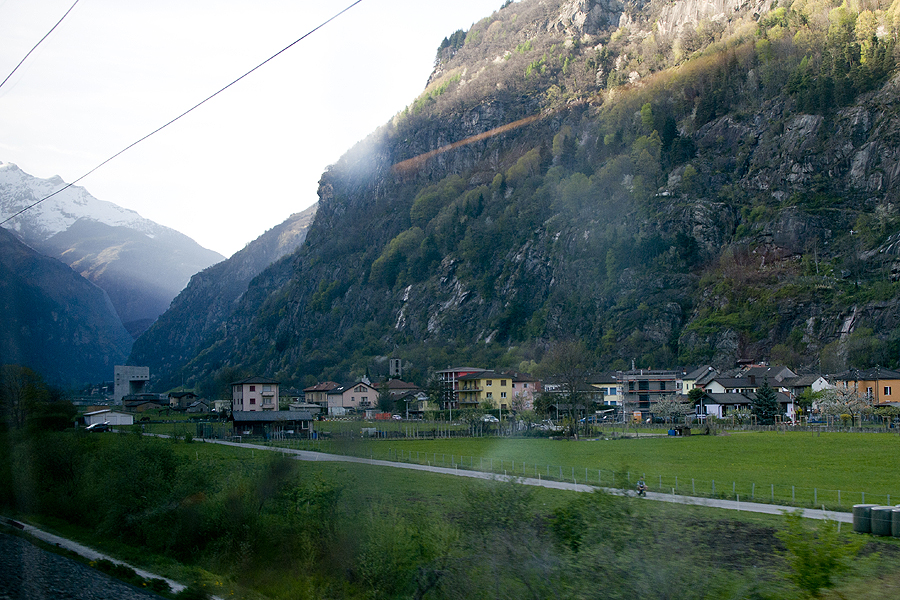 Penktadienį po vyro darbo ir vaikų mokslų atsibeldžiam į Ciurichą ir savo idiliško, bet nuobodaus šveicariško kaimuko, į traukinį iki Milano. Tokių gražių vaizdų dar nebuvau mačius, tai buvo mano pirmas kartas Šveicarijos Tičino kantone. Važiavome tarp kalnų, pavasarinių krioklių, mažų kaimelių, bažnytėlių Alpėse, nuostabu... Gaila, gan daug žmonių traukinyje važiavo, negalėjau kaip reikiant įsijaust su fotografavimu. Bet gal ir gerai :)