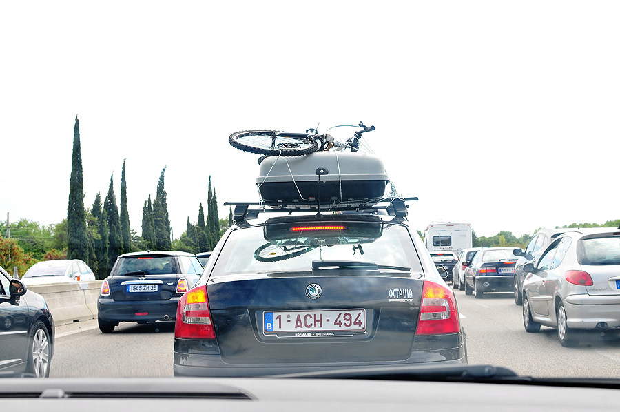 Važiuojame link Avinjono - mokamos autostrados ir kamščiai vidury dienos - visi mina link jūros. Trijų juostų kelias užsikimšęs visiškai. Bandom išsukti į šoninį keliuką.