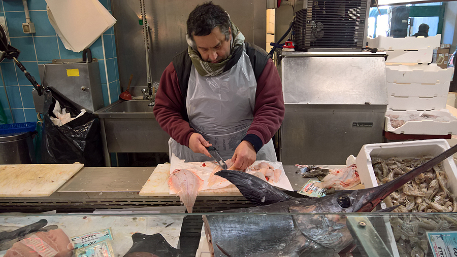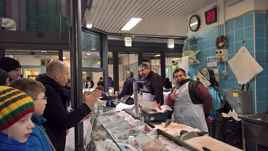 Einame iki turgelio ir perkame maistą Naujųjų metų vakarienei - šviežią žuvį, vyną, daržoves. Pardavėjas meistriškai išdarinėja plekšnę, žiūriu ir žaviuosi.