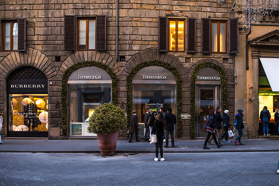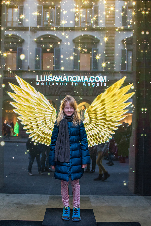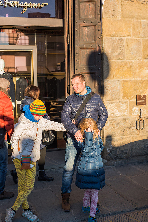 Prie Feragamo parduotuvės. Sakau šeimai, jūs eikit namo, susitiksime vakare. Argi jie ne mieli po Italijos saule?