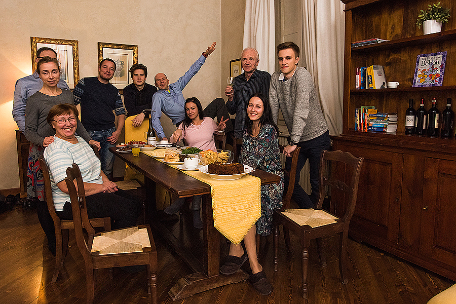 Vakarop einu namo, ruošiam šventinį stalą. Renkasi giminė, statau fotoaparatą ant stovo. Va tiek mūsų buvo!