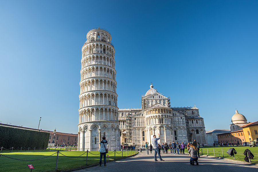 Ima juokas, nes fotografuojant plačiakampiu objektyvu, bokštas gaunasi tiesus!!! Ėėėė, man ne to reikia! Keičiu fotografavimo kampą, kad būtų viskas, kaip yra - kreiva. Pilna "laikančių" kreivą bokštą žmonių.