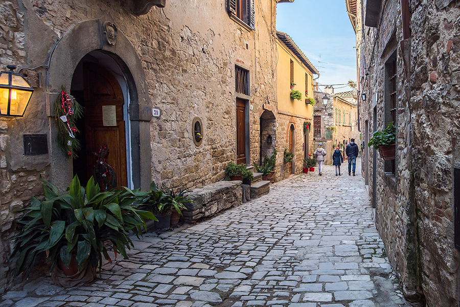 Miestelyje yra išlikę 14 bokštų, kuriuose anksčiau buvo laikomi prieskoniai. Jie priklausė turtingųjų šeimoms, kurios varžėsi tarpusavyje, kas pasistatys aukštesnį bokštą. Buvo pastatyta iki 72 bokštų, aukščiausias iš jų buvo 70-ties metrų, kol miesto valdžia uždraudė statinius, aukštesnius, nei miesto savivaldybės rūmų bokštas.