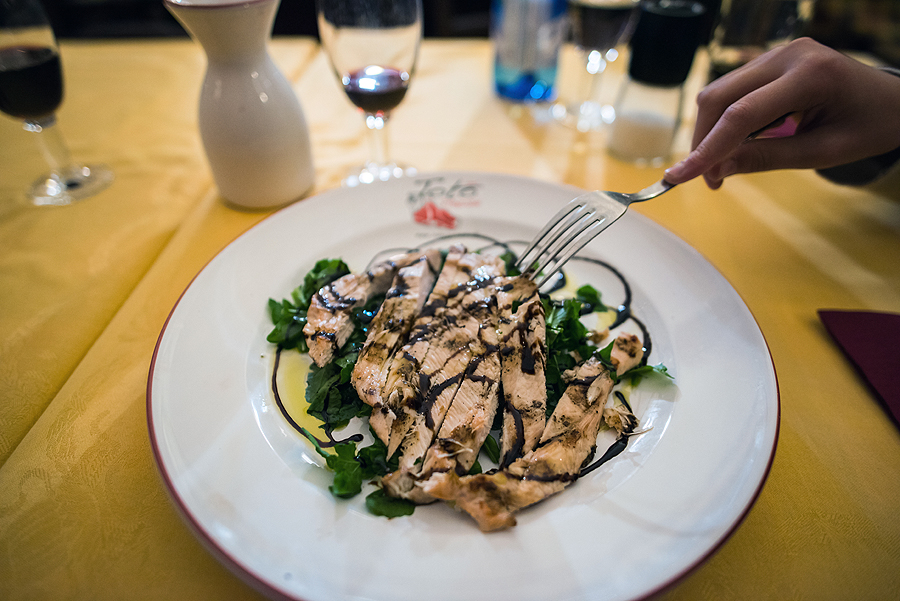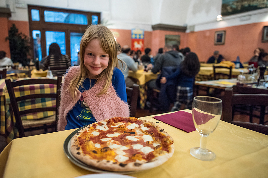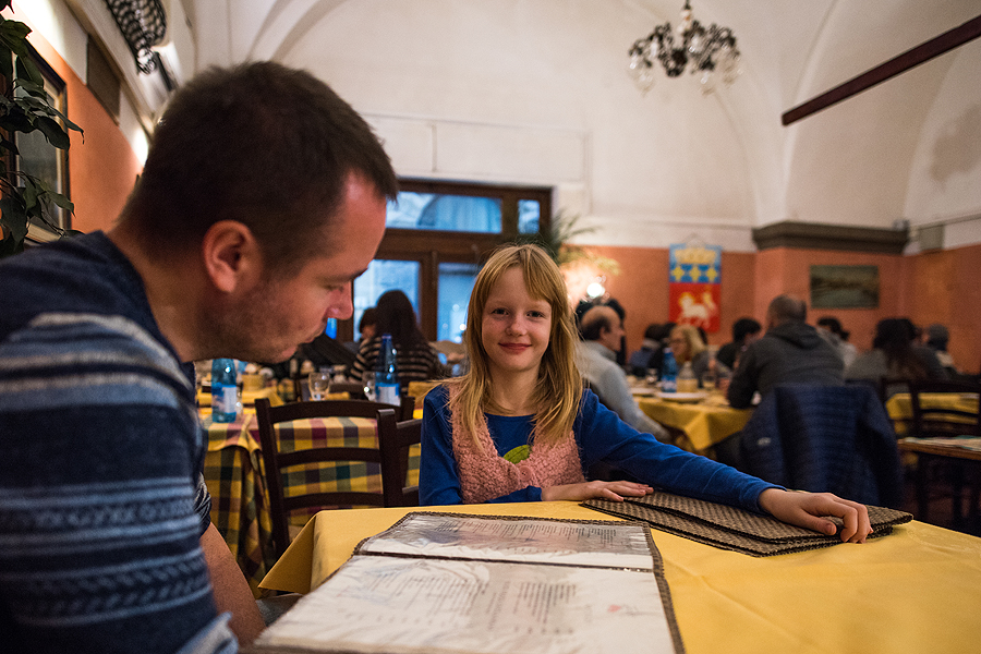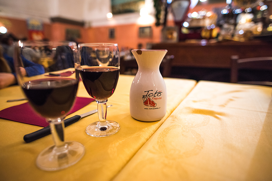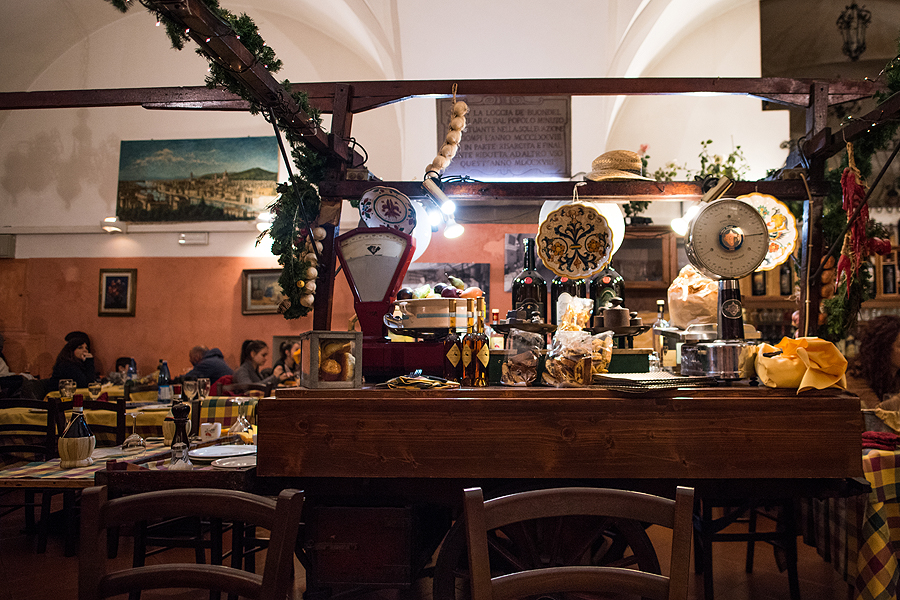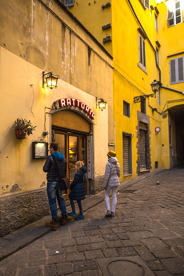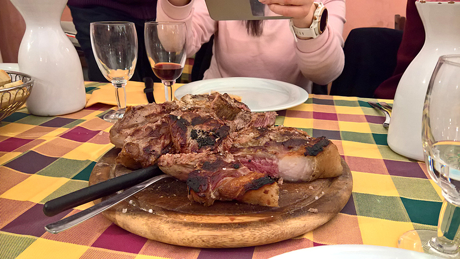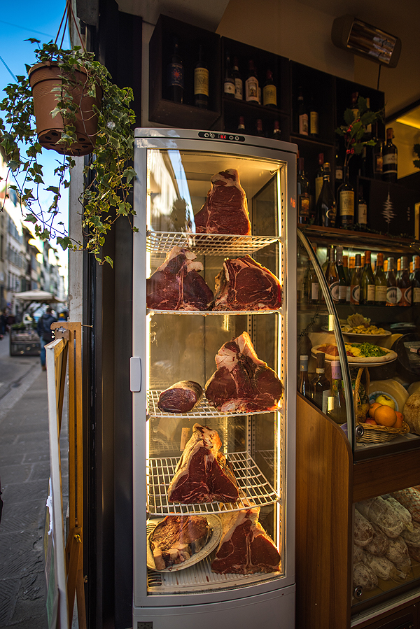 Užsukome pavalgyti. Šioje tratorijoje matėme, kaip pjaustė mėsytę - grįžome su gimine vakarienės. Mėsos reikia užsisakyti gan didelį gabalą, nes mažiau - tiesiog negalima, neišeis iškepti. Porcijos Florencijoje ne vokiškos - tai yra nėra didelės, normalios. Aš, kaip nemėgėja mėsos, kartą paragavus, lieku prie savųjų maistų - lazanijų, picų, fokačia, salotų, duonytės su aliejum ir balzamiku... na, Italijoje nepabadausi.
