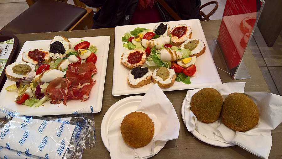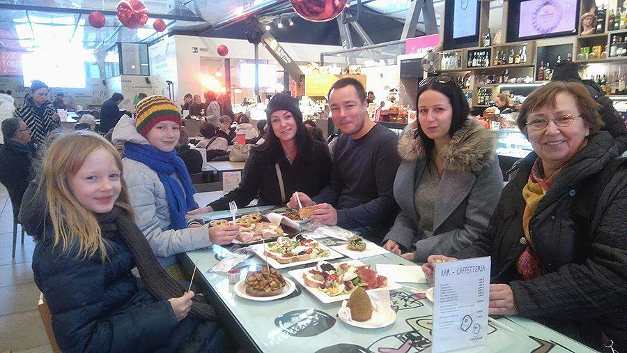 Užsisakom visko po truputį paragavimui - pasiimam pora lėkščių sumuštinių su įvairiais tepalai su triufeliais. Nesužavėjo skonis. Gal dar ragaučiau, kad pataisyti įspūdį apie triufelius. Bevalgydami, susitinkame su visa gimine. Kada pusryčiams valgėm triufelius ir gerėm vyną? Per kalėdas Florencijoje su gimine!