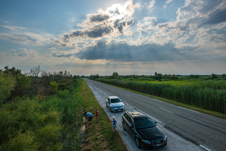 Pakeliui išsizyziu pasukti į šoną apžiūrėti pelkių ir nusiviliu - apžvalgos bokštelis rodo į pelkę, kurkia varlės, bet man to maža. Visi tyrinėja gyvūniją, aš fotkinu nuostabų dangų. Kadangi iki druskų gan toli, nebevažiuojame.