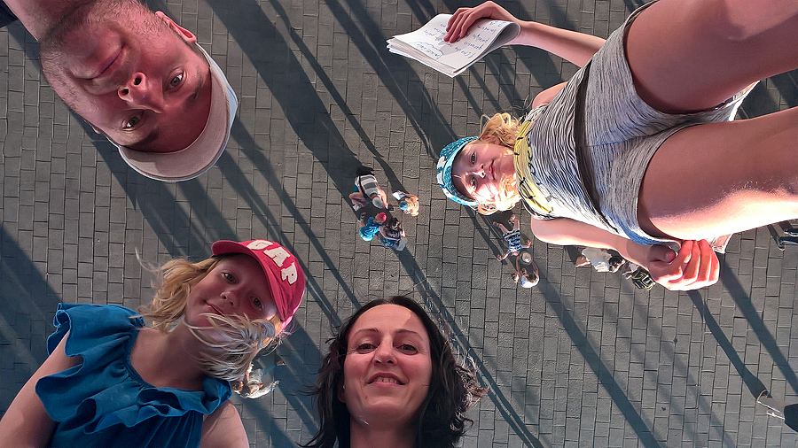 Prieiname smagią atrakciją - aukštai pakeltą milžinišką veidrodį. Vakaro saulės šešėliai, nuostabu!