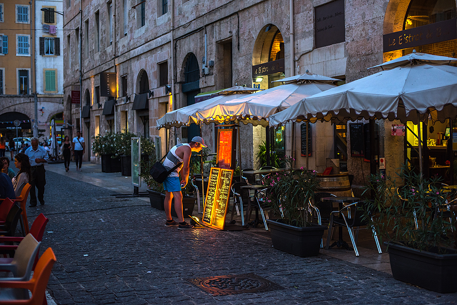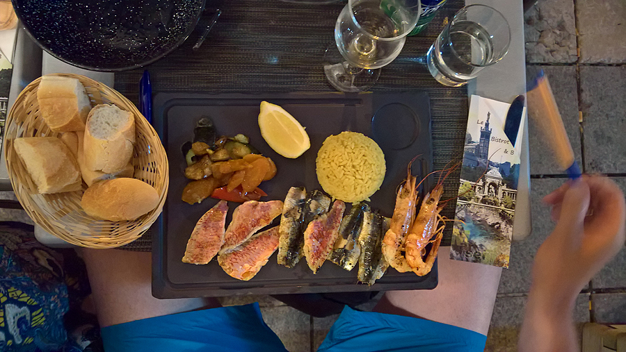 Tuo ir apsiribojame jo apžiūra, nes girdisi nepatenkintas pilvų urzgimas. Paeiname atgal ir sukame į dešinę, į Operos rajone knibždančių restoranėlių gausybę, ieškome savo norimų maistų viename - picų, jūrų gėrybių, sesuo su vyru nori paragauti ir firminės Marselio sriubos Bouillabaisse.