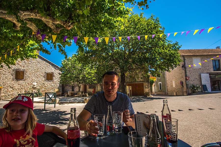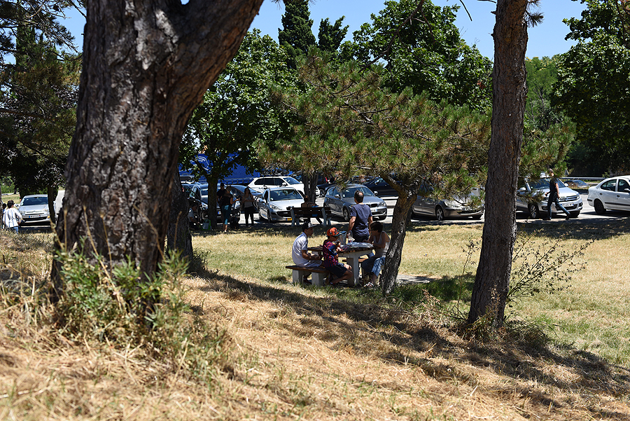 Čia jau kažkelintas sutojimas šalia miestuko Baix, nes vis tiek patekome į kamščius Prancūzijoje. Karšta baisingai, eisime kažką persirengti lengviau. Aplink visi piknikauja, daug žmonių, visi juda link Viduržiemio jūros. Mes irgi užkandame namudinių sumuštinių.