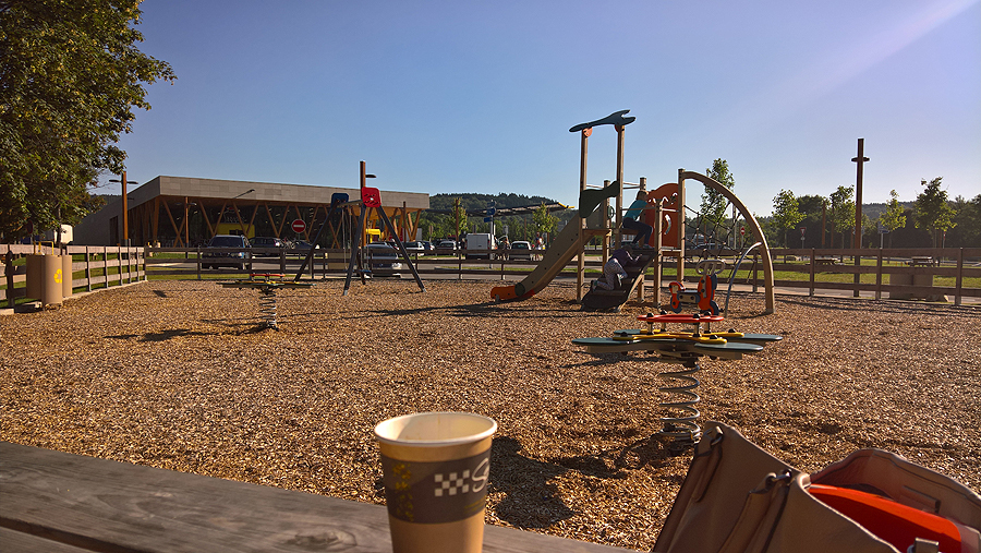 Pirmas sustojimas pusryčių - jau Prancūzijoje, tik pervažiavus sieną miesteliokyje Ceignes. Šilta, nors dar tik ankstyvas rytas. Mankštinam kojas, geriam kavą, valgom kruasanus ir vėl į kelią. Vaikai dar spėja pasimalti žaidimų aikštelėje.