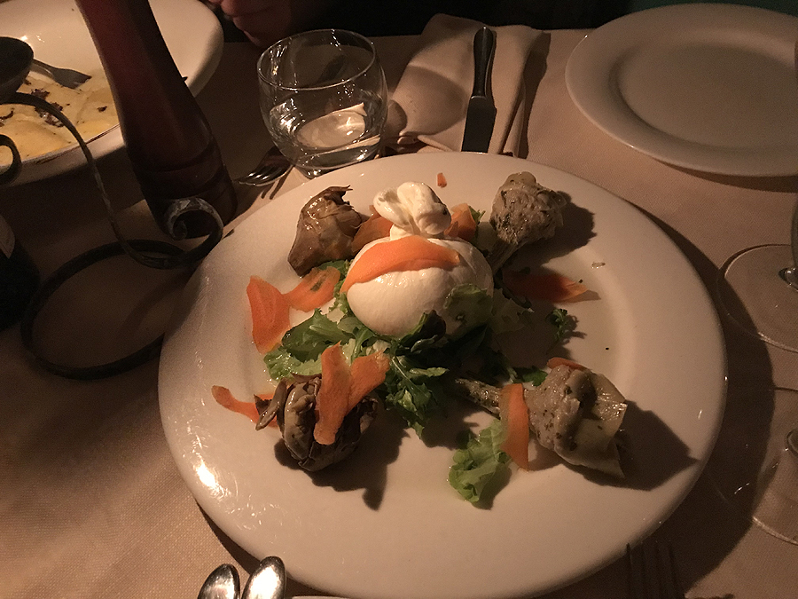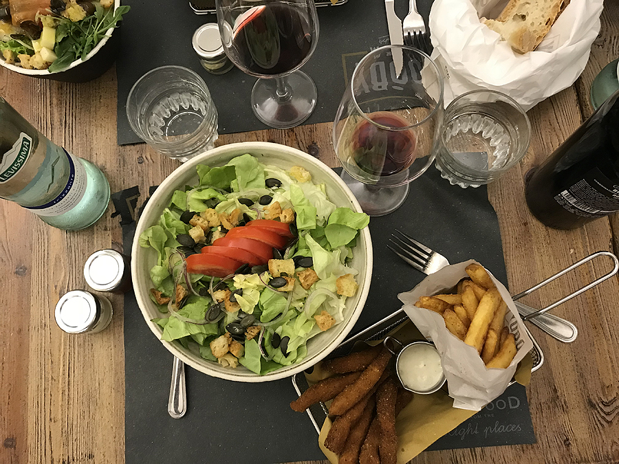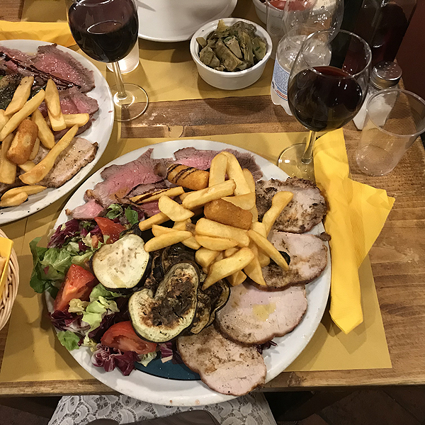 Padavėja tamsi, žemo balso tvirtai sudėta mergina su Elena kalba itališkai. Likusios karpom ausim. Elena išverčia, jog visas maistas čia super šviežias ir ekologiškas, bet mano pilvui tas neįdomu. Paprašau angliško meniu, kad ilgai nelaukus vertimo galėčiau būti savarankiškas žmogus. Vištienos pagaliukai su bulvytėm ir salotų bliūdas, svogūnai, pomidorai, duoniukai ir sėklos - salotų ingredientų gali rinktis kiek tik nori. Žinoma, plius raudono vyno butelis visoms. Nuostabus maistas, bulvytės tirpsta burnoj, salotų porcija gigantiška. Grįžta gyvenimo džiaugsmas.