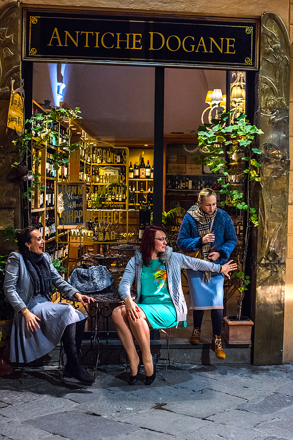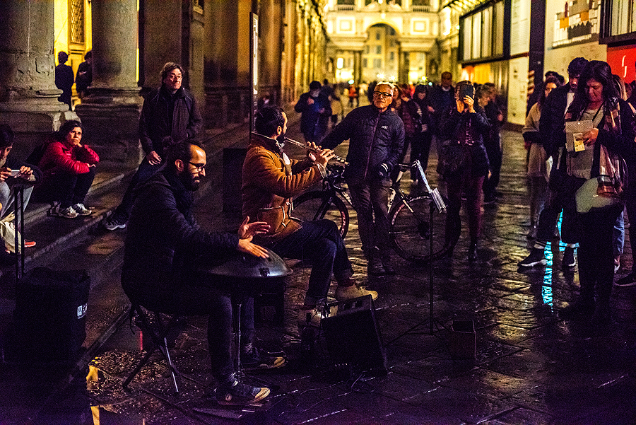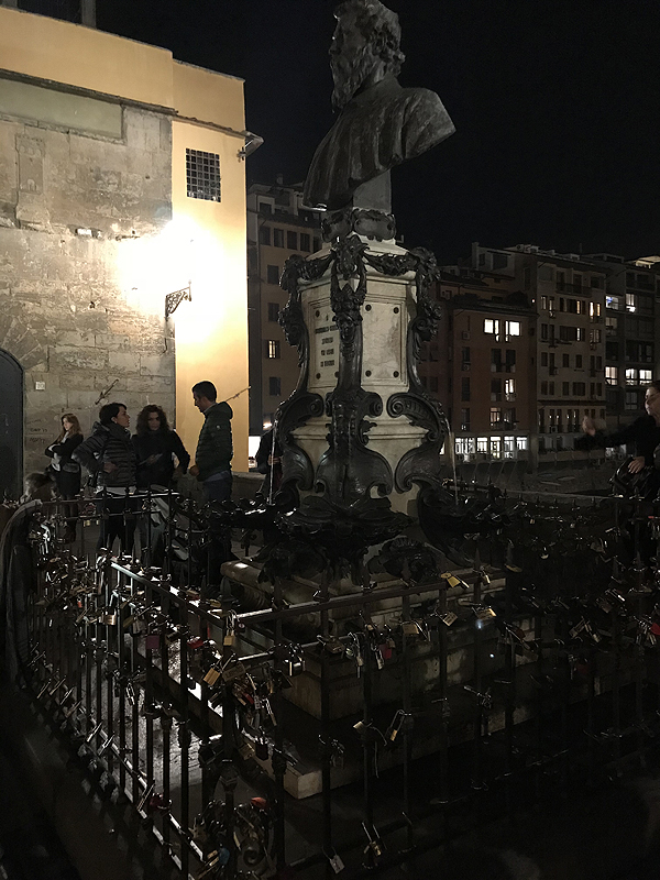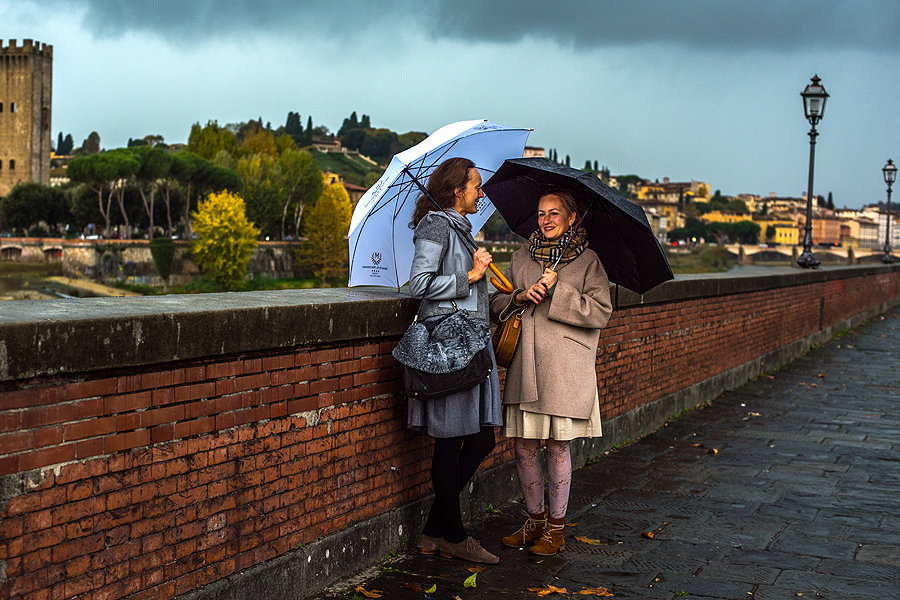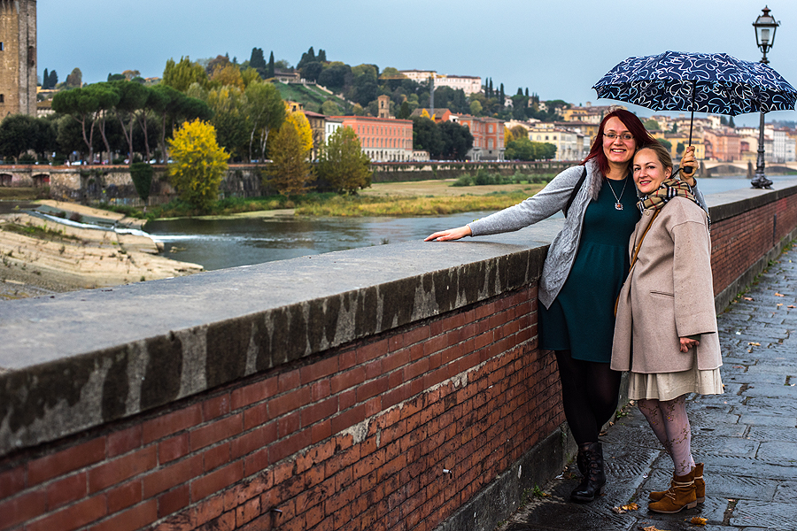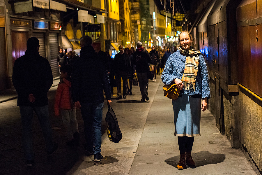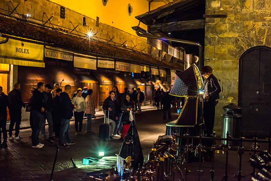 Ant Ponte Vecchio vyksta lėlių spektaklis su nostalgiška muzikėle. Visi žiūri, fotografuoja. Aš stebiu gatvės muzikantus, prie vietinio priėjo keliaujantis ir paklausė, ar galima ir kur galima koncertuoti. Simpatiškas pagyvenęs italas su jauna gražuole blondine fotografuojasi ir nueina meiliai žiūrėdami viens kitam į akis. Mano draugių nematyti, nors jau laikas.