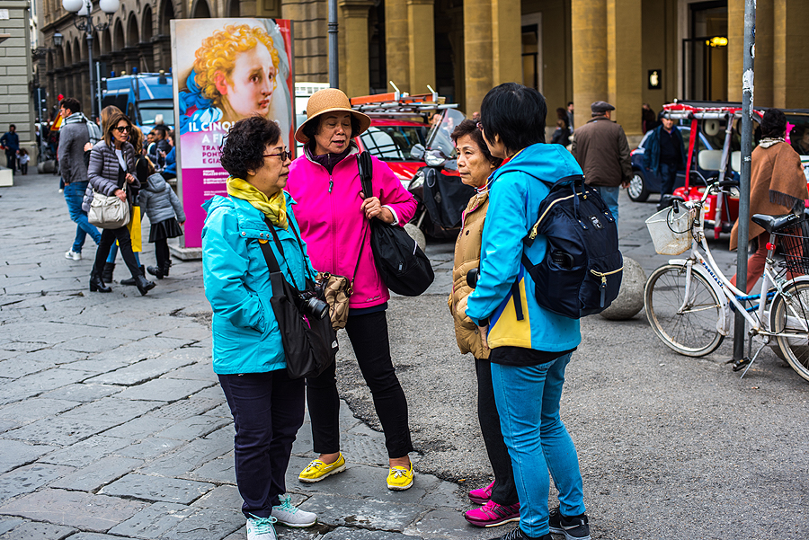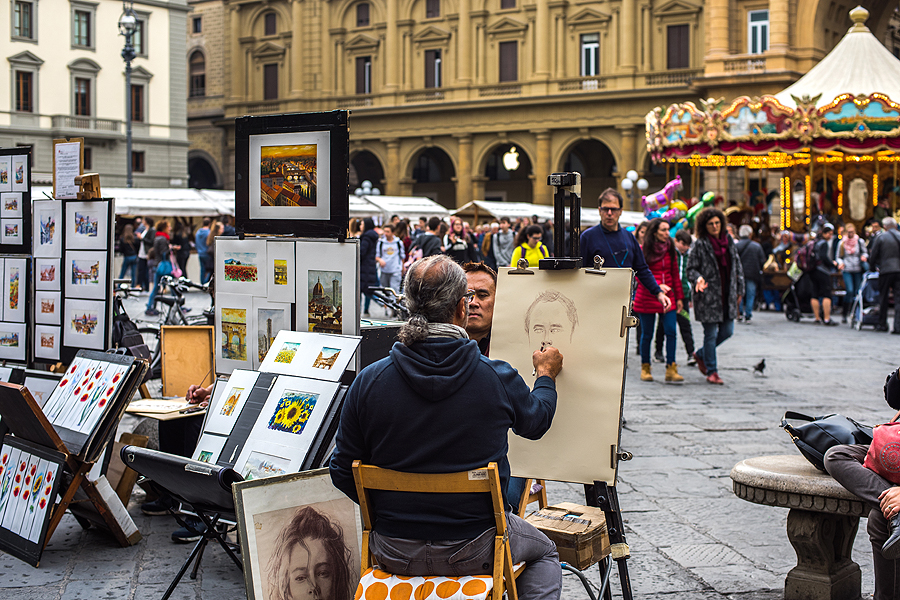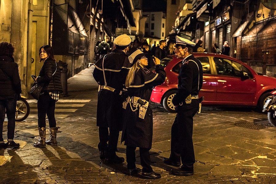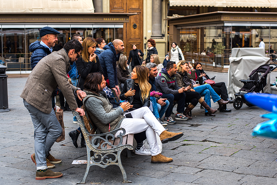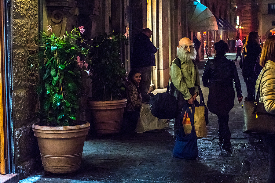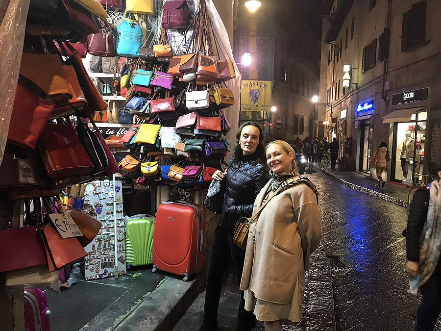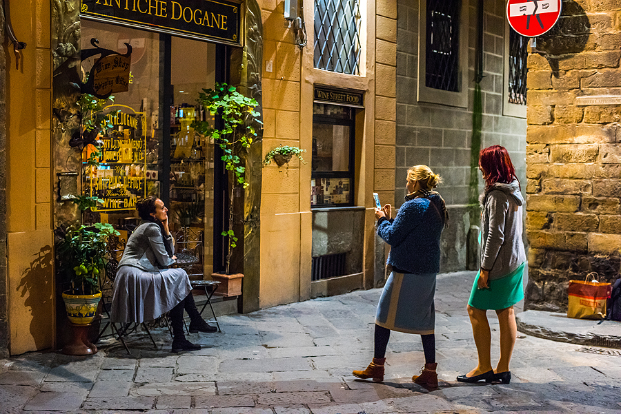 Ant Ponte Vecchio vyksta lėlių spektaklis su nostalgiška muzikėle. Visi žiūri, fotografuoja. Aš stebiu gatvės muzikantus, prie vietinio priėjo keliaujantis ir paklausė, ar galima ir kur galima koncertuoti. Simpatiškas pagyvenęs italas su jauna gražuole blondine fotografuojasi ir nueina meiliai žiūrėdami viens kitam į akis. Mano draugių nematyti, nors jau laikas.