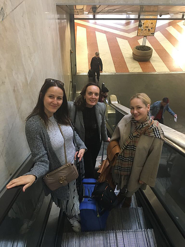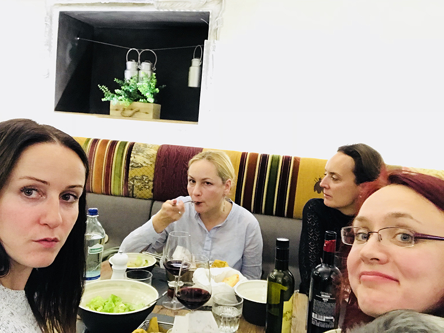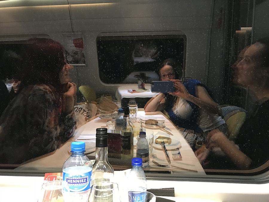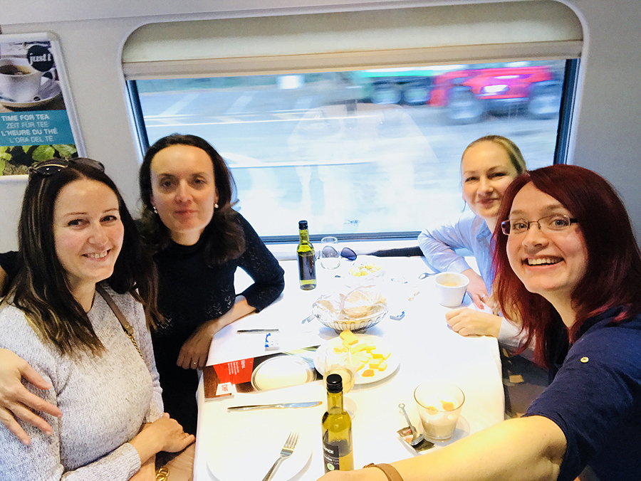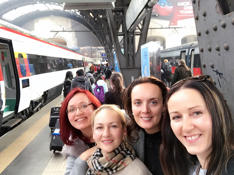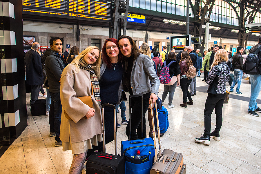 Susitinkam visos iš skirtingų miestelių vienoje stotyje. Traukinio platforma keičiasi, bėgam. Atlekiam, pamatom, jog traukinys vėluos. Aptarinėjam persėdimo galimybes Arth Goldau ir Milane, tada vėl platforma keičiama į trečią variantą! Vėl su lagaminais bėgam per visą peroną. Pagaliau atvažiuoja traukinys! Įlipam, vienas etapas sėkmingai įveiktas. Milano traukinys persikimšęs, bet galų gale susirenkam visos keturios vagone restorane. Vyno už kelionės pradžią!