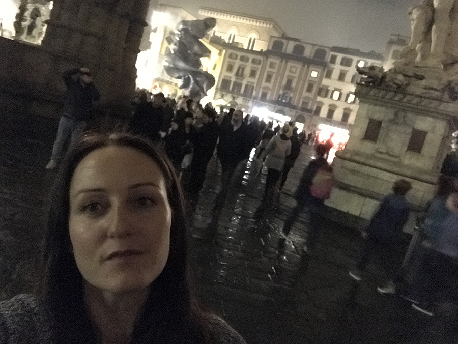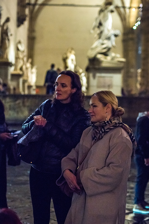 Ir patenkame į stebuklą - šalia Piazza della Signoria aikštės groja muzikantai, muzika rami, lengvas rūkas, matosi skulptūros šalia Palazzo Vecchio, atmosfera stebuklinga. Ilona, mūsų muzikė, ir Elena stovi užburtos ir klausosi. Mes su Justina, fotografės, stovėti negalim, lakstom, geriam vaizdus į save ir fiksuojam, fiksuojam, fiksuojam...