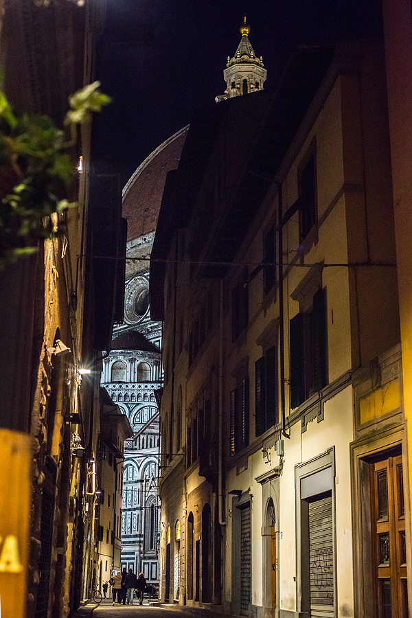 O toliau - tarp namų namelių nematoma, pasislėpusi Duomo... Bevaikštant po miesto centrą, senamiestį, ji vis šmėkšteli, tai bokštas, tai kupolo viršūnė kur... mastelis su žmonėmis lyginant įspūdingas...