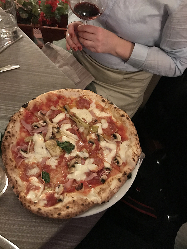 Pica, iškepta kronyje labai nesužavėjo, padas ne traškus, o daugiau guminis, bet viršus labai skanus. Vynas - puikus, išlaikytas 10 metų, brangiausias gertas, turbūt. Kainą mums nuo 90eu nuleido iki 50eu. Kaip pasakytų mano vyras - savikaina turbūt 5eu. :)