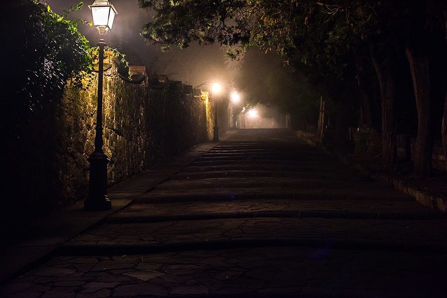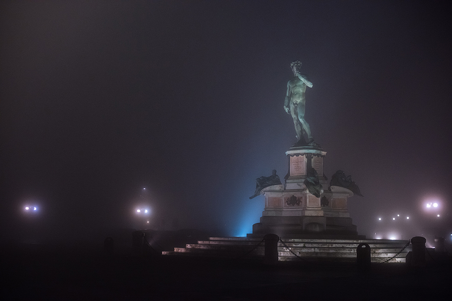 Ir keliai skiriasi - dvi eina link viešbučio, o mes su Justina, žinoma, į Mikelandželo aikštę, kur matosi miesto panorama. Nerealiai atrodė laiptai rūke apšviesti žibintais, kamerą vietoj stovo pasidedu ant stovėjusios šalia mašinos - reik suktis iš padėties. Deja, neįvertinom, kad rūkas uždengė ir mūsų miesto panoramą... tiršta, tiršta... po truputį einame namo...