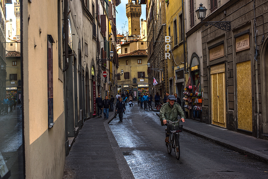 Ir vėl leidžiamės į gatvelių labirintus. Ir vėl varvinam seilę į odinius dirbinius. Na, gerai, aš varvinu. Tikslas įlipti į Palazzo Vecchio muziejaus bokštą. Ir spėti iki 13,15, nes Justina tada eis į Uffizi gallery muziejų, o likusios - į miestą batų.