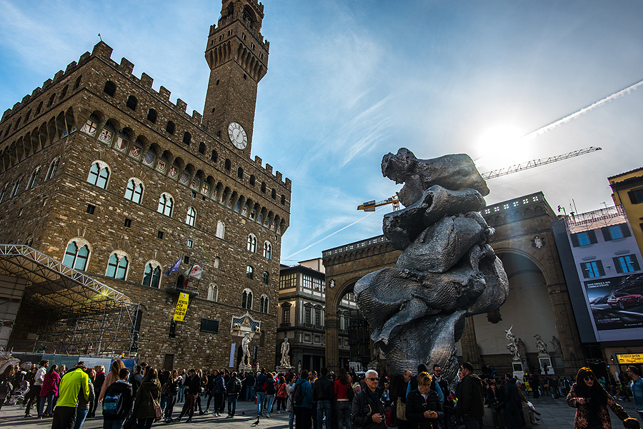 Mes vėl Piazza della Signoria aikštėje. Matosi mano mielasis bokštukas :) Eilės į muziejų nėra, puiku! Žiemą teko stovėti virš valandos. Perkam bilietus ir einam į vidų.