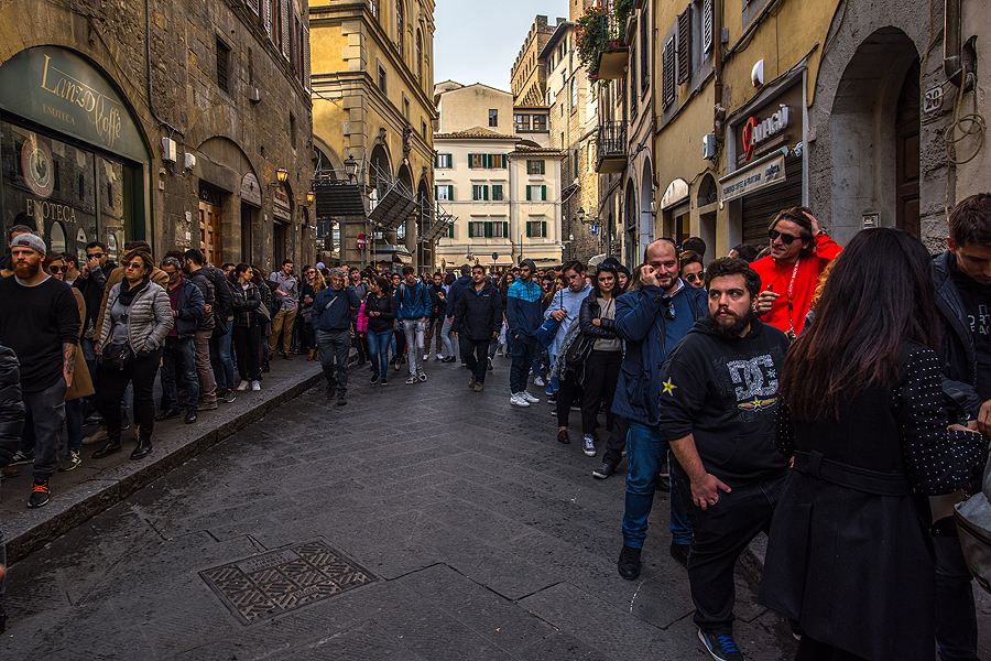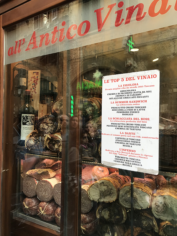 Štai dėl šios užeigėlės vie dei Neri gatvėje visi išprotėję stovi eilėse. Valgo sumuštinius panini - iš abiejų pusių batonas, viduj mėsa, dešra, daržovės, salotos. All'Antico Vinaio - socialinių tinklų stebuklas.