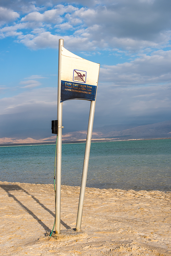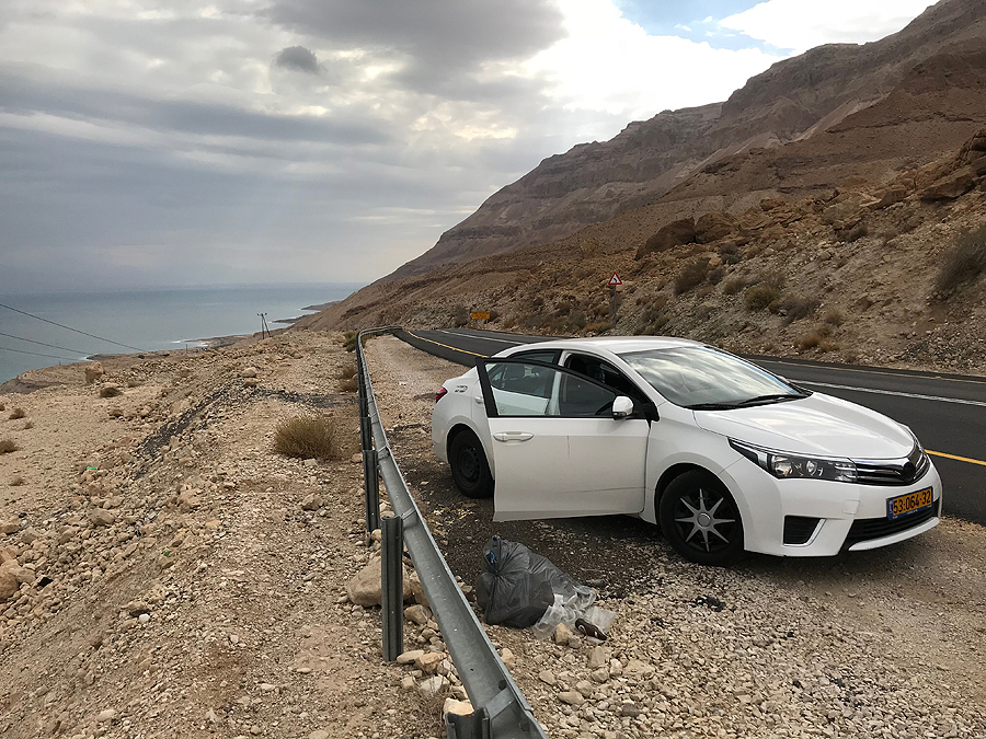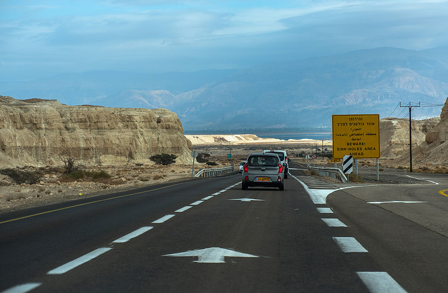 Pravažiuojame Ein Gedi miestelį, toliau krantai aukštėja, pilna draudžiamų vaikščioti ir maudytis, perspėjančių apie smegduobes ženklų.