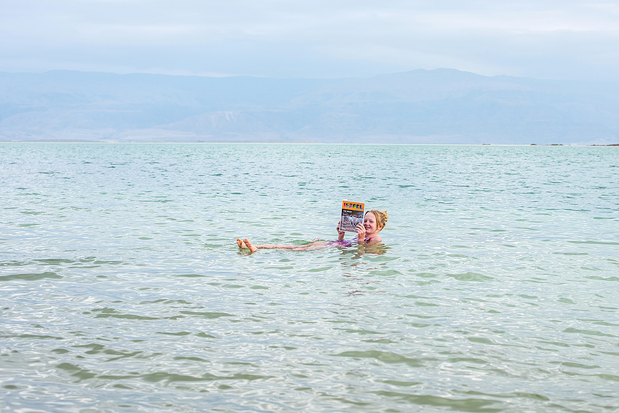 Paskui pozuoju nuotraukoms. Mano mažylė stebi mane ir pati nedrįsta “gultis”. Aš organizuojuos spec šiai progai pasiimtą Izraelio turizmo lankstinuką. Adrenalino ir euforijos mišinys. Mažė irgi jau guli, duodu ir jai “paskaityt”.