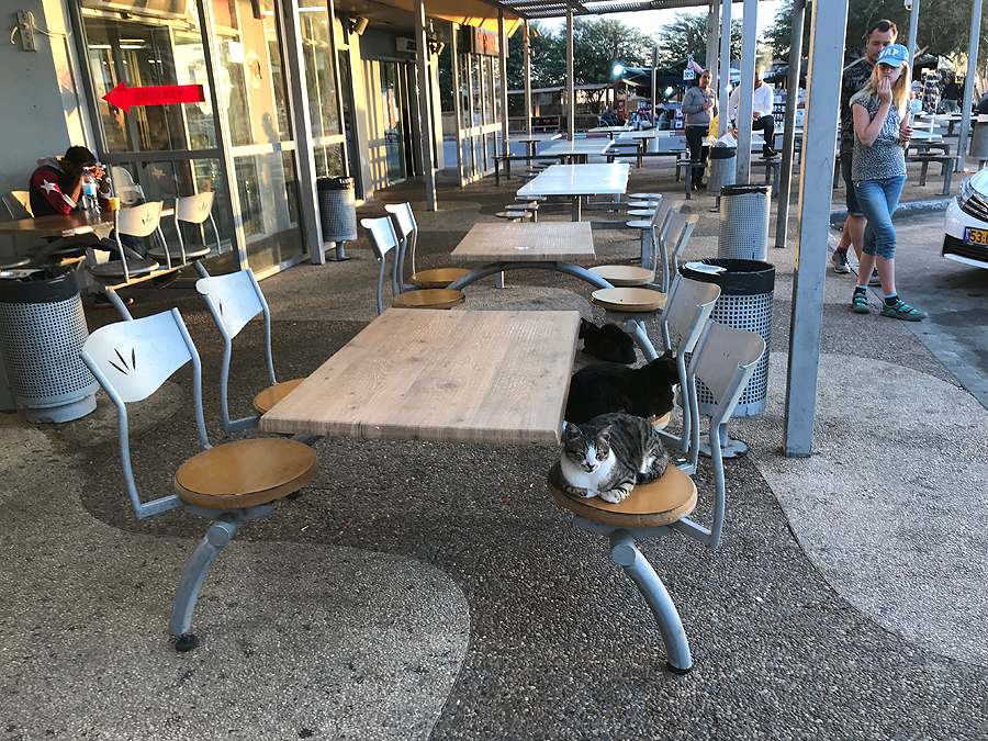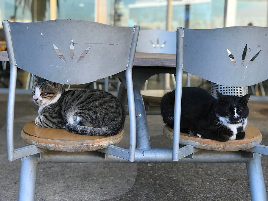 Stojam degalinėje. Ledai, kava... Apžiūrim vietinius katinus.
