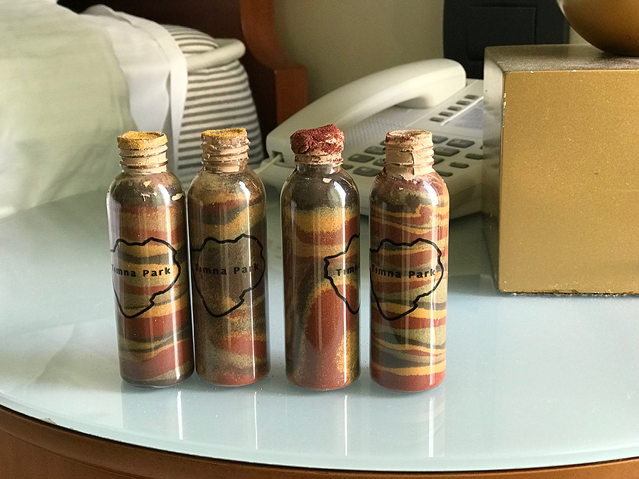 Mokam įėjimo-įvažiavimo mokestį dviem suaugusiem ir dviem vaikam 176 šekelius, gaunam galimybę iš spalvoto smėlio į mažus buteliukus susipilstyti suvenyrą atminčiai.