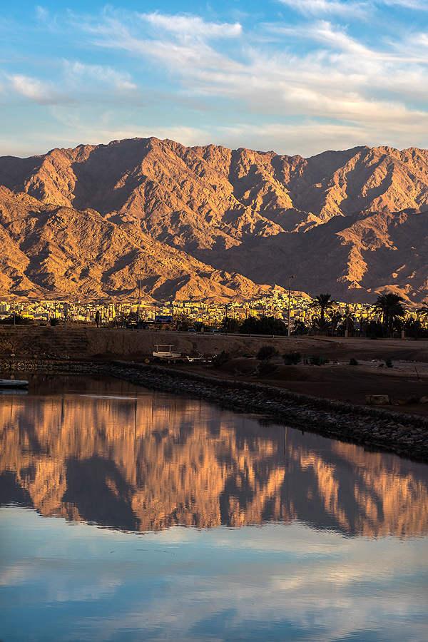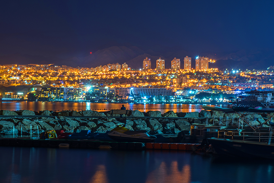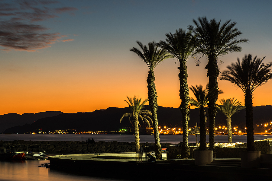 Fotografuoju su didžiausiu malonumu - vaizdas, šviesa - viskas nuostabu. Laukiu, kol įsižiebs pirmosios šviesos, tada lb gražu fotografija su ilgesniu išlaikymu. Išsitraukiu stovą, ir suvokiu, kad tvirtinimo galvutę "fotoaparatas-stovas" palikau viešbuty... Vaizdai fantastiški, bet man, palikusiai galvą, tiesiogine prasme, tenka grįžti į viešbutį. Kol einu link namų, saulė dingsta nuo kalnų. Grįžtu beveik bėgte atgal. Tiesiai ant plačiavaizdžio molo. Fotografavimo vaizdų - tik sukiokis ir fiksuok! Aqabos šviesos, Eilato šviesos, palmės, viešbučių-monstrų žiburiai vandenyje, skėtukai nuo saulės, laivas jūroje, ech...