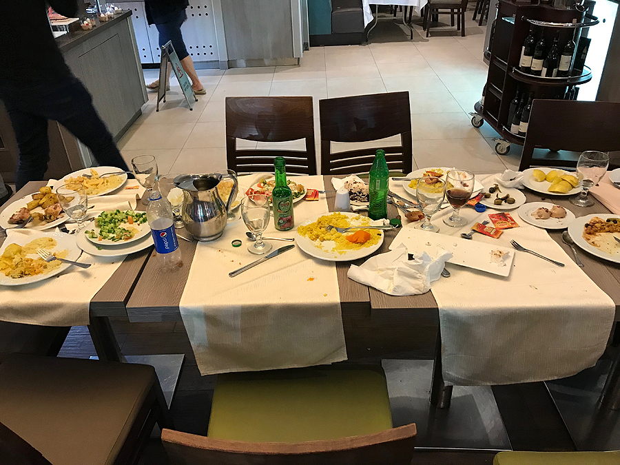 Prisifotkinus skubu į viešbutį paskutinės vakarienės. Ko nepasiilgsiu, tai musulmonų elgesio valgykloje - lenda, stumdosi, prisikrauna ant stalo maisto, kaip per mūsų Kalėdas ir jo nesuvalgo, palieka baisius šiukšlynus išeidami. Visada būriais vaikšto, niekada po vieną, gal moterim negalima? Vietiniai kultūringi, kiti turistai - viskas ok. Bet dauguma musulmonų mūsų viešbutyje.