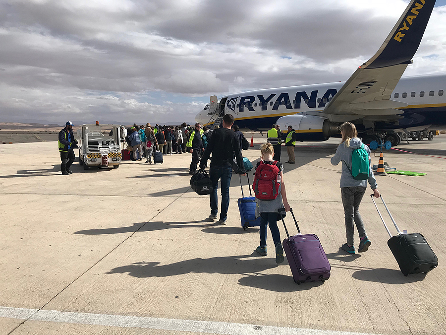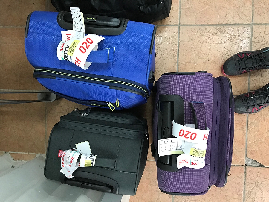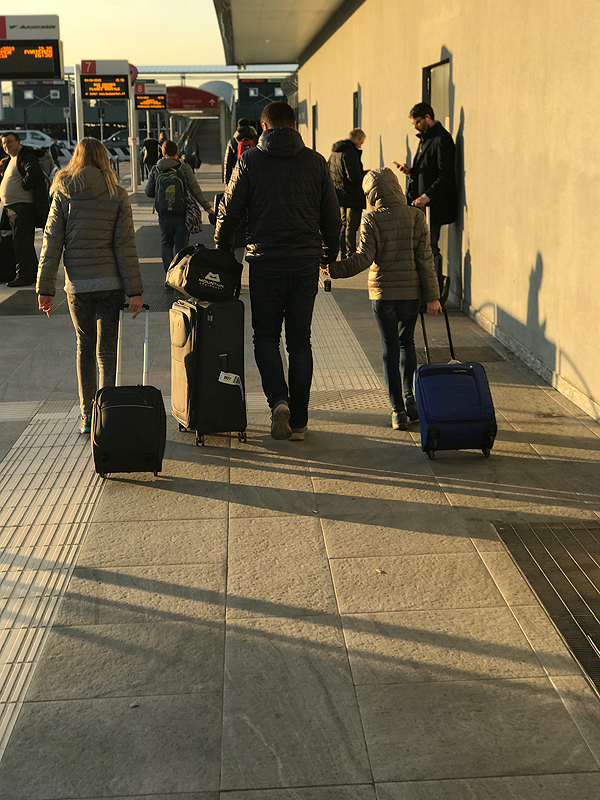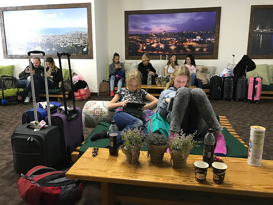 Už fiksuotą oficialiai nustatytą sumą (250šek) mus pristato į oro uostą. Jį atidaro 9 ryto, dar turim palaukti. Atsakom į klausimus - kur buvom apsistoję, ar buvom palikę lagaminus be priežiūros, pažiūri atidžiai į mūsų nuotraukas pasuose ir praleidžia, lagaminų tikrinimas - jų atidaryti nereikia, tik praleisti per skenavimą, pasų tikrinimas, kokie 6-7 punktai. Eilių nėra, pora valandų iki skrydžio jau būnam apsiforminę. Čia dėl to, kad anksčiau atvykome, nes už savęs matome jau nemažai žmonių...