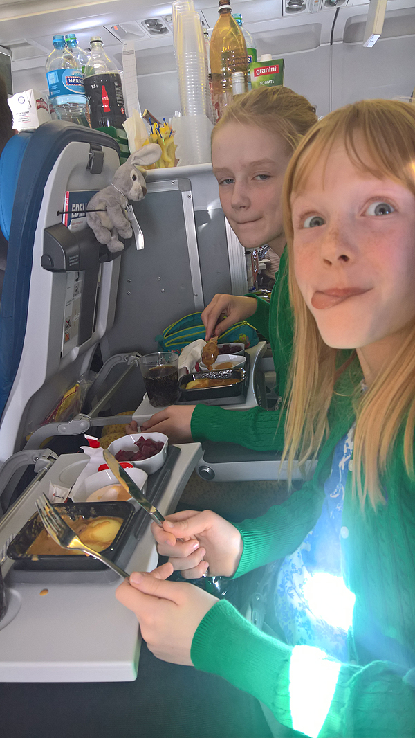 Pirmasis mūsų skrydis su užsakytu lėktuvu - gauname nuostabiai skanų guliašą su bulvių koše ir burokėliais - vos ne kaip Lietuvoj pas mamą.