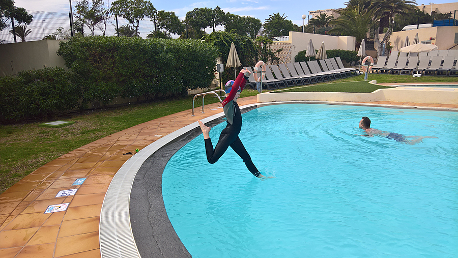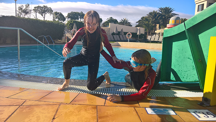 Ir ką, pusrytukai ir išbandyti hidro kostiumų. O jie pasiteisino, dar ir kaip! Šalta tebuvo pėdoms ir rankoms, dar žinoma, galvai, paskui užmoviau ir baseino kepures, nes vėjas nešvelnus - buvo visada. Sako, Lanzarotė vėjuočiausia iš visų Kanarų salų. Kitose nebuvau, bet Lanzarotėje vėjo yra.
