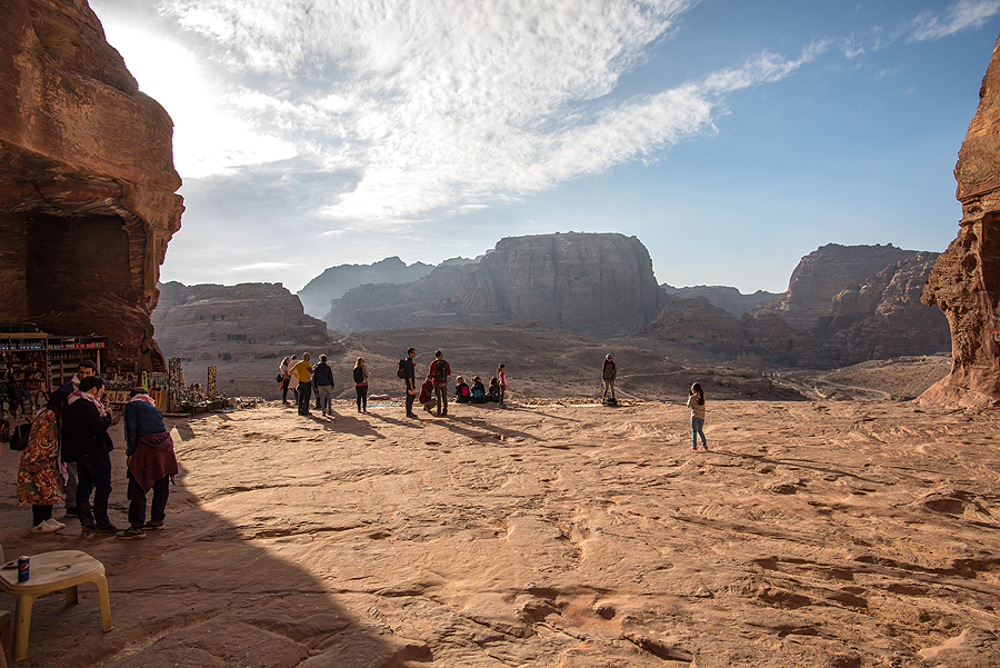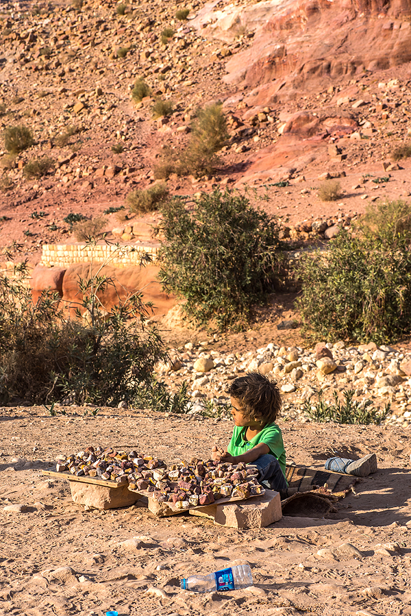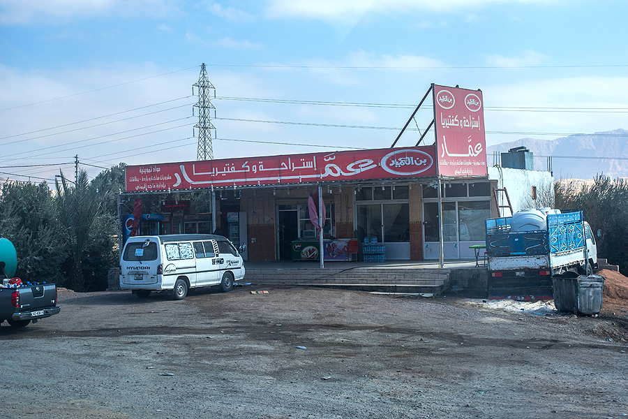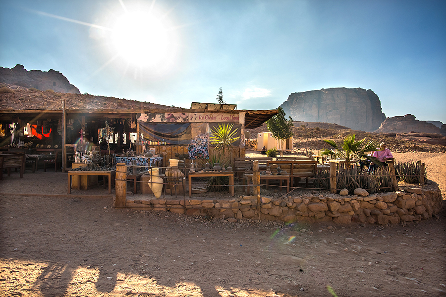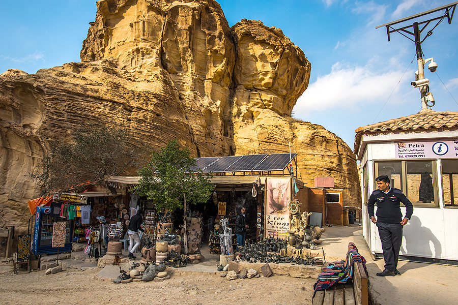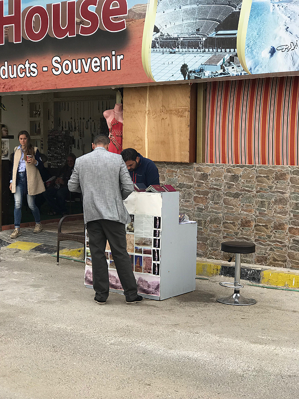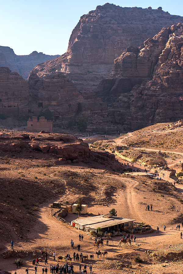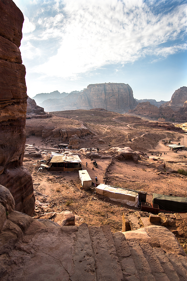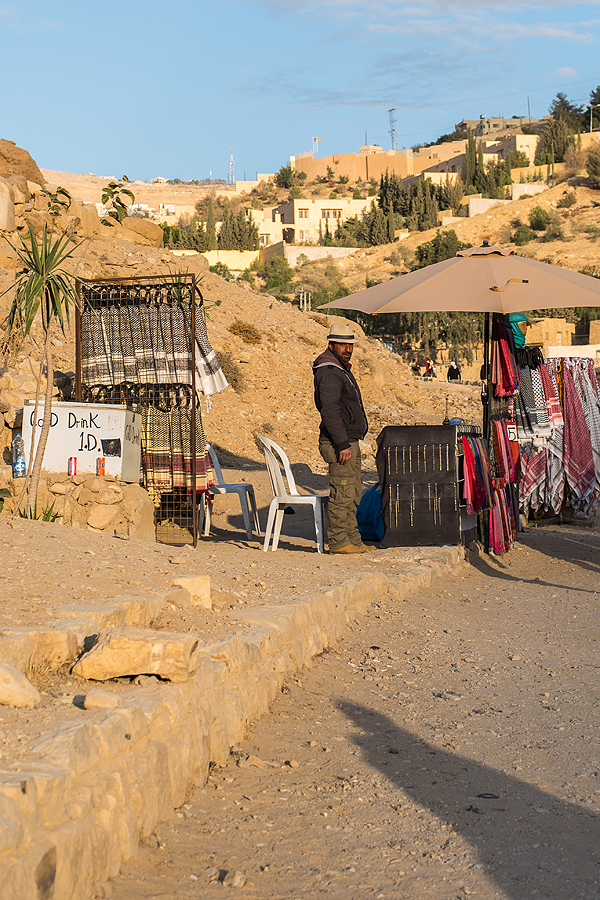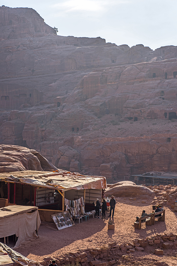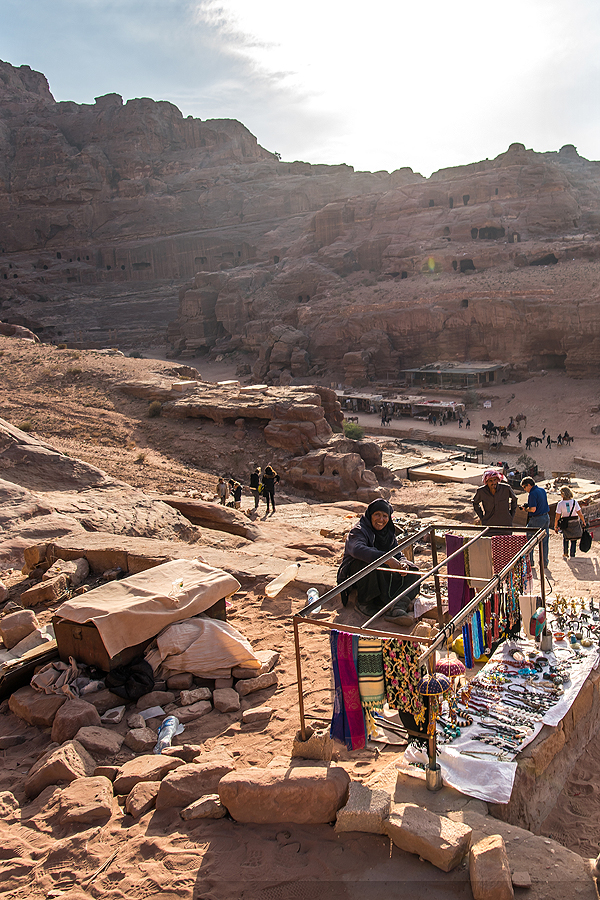 Stojam prie bariuko-užeigėlės su Petros miesto panorama iš viršaus ir turim galimybę fotografuoti, kiek telpa. Bariuke vaišina maistais, o kavą turim pirkti už dinarą ar mažiau, neįstrigo...Nusiperku kavos, ji specifinio, bet malonaus skonio, su kardamonu. Ją darė tokia moteris kaip iš filmų, su skarom, juodom akim ir nekalbanti nė žodžio angliškai, užtat dantys balti balti, šypsojosi. Užlipu ant stogo, padarau keletą kadrų. Viduje - pilna įvairiausių suvenyrų, krūvomis, nuo kilimų iki mažų statulėlių. Bet aš jau viską turiu.