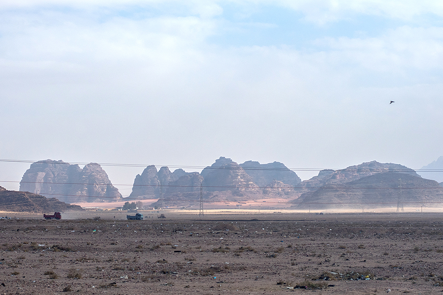 Pravažiuojam ir Wadi Rum dykumą, matosi iš tolo įspūdingi kalnai, uolos.
